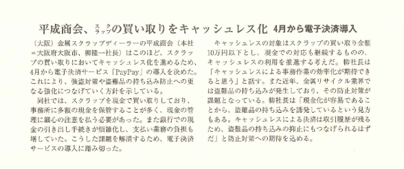スクラップの買い取りにおいてキャッシュレス化を進めるため、4月から電子決済サービス「PayPay」を導入をいたします。従来通り現金でも買い取り可能ですので、ご希望の受取方法をお選びください。